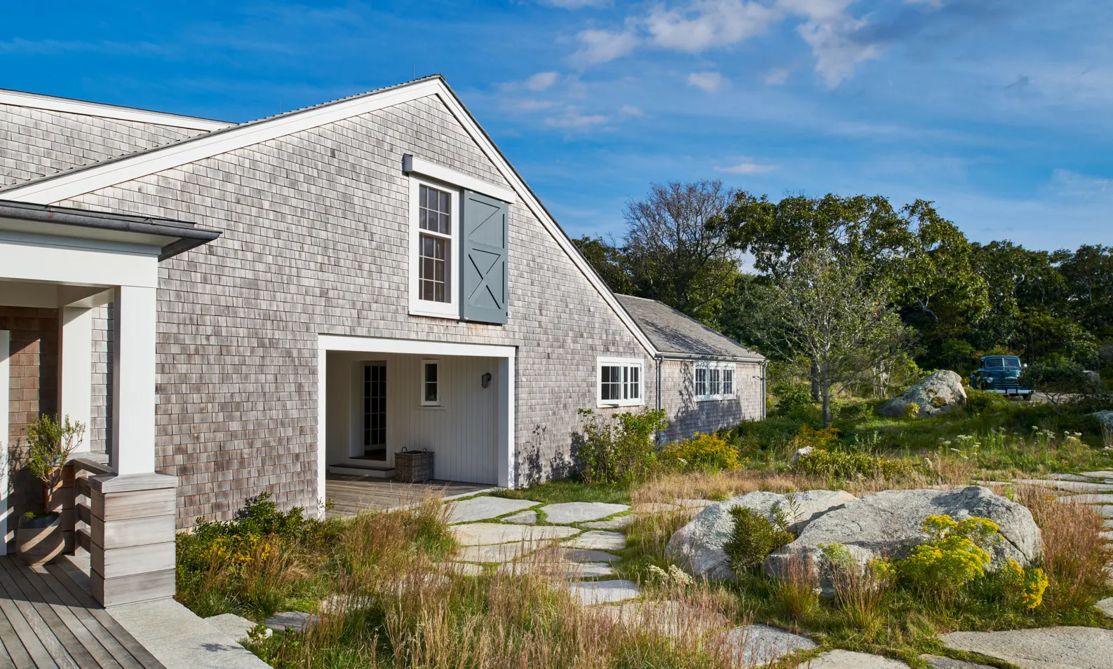 A guest retreat on a coastal compound in New England is composed of peaceful spaces that blend into the surrounding landscape. What appears to be two separate structures is actually one masterfully laid out building.