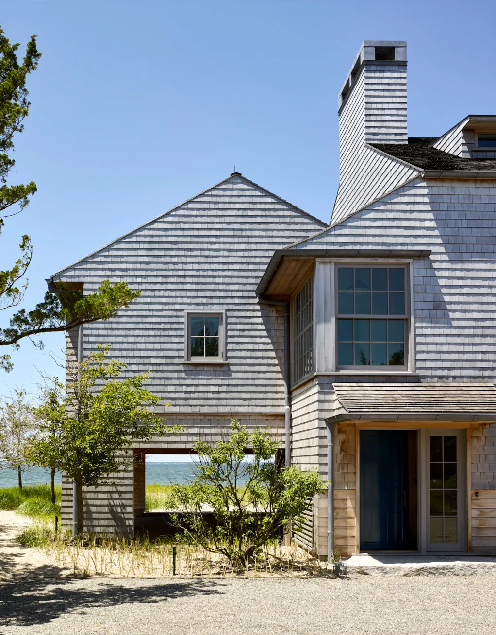 A shingle style beach house that overlooks Great Peconic Bay in Southampton, New York. The colorful interior palette draws from the surrounding landscape. A sweeping porch stretches along the beach to take advantage of the stunning views. Interior design by FERRER.